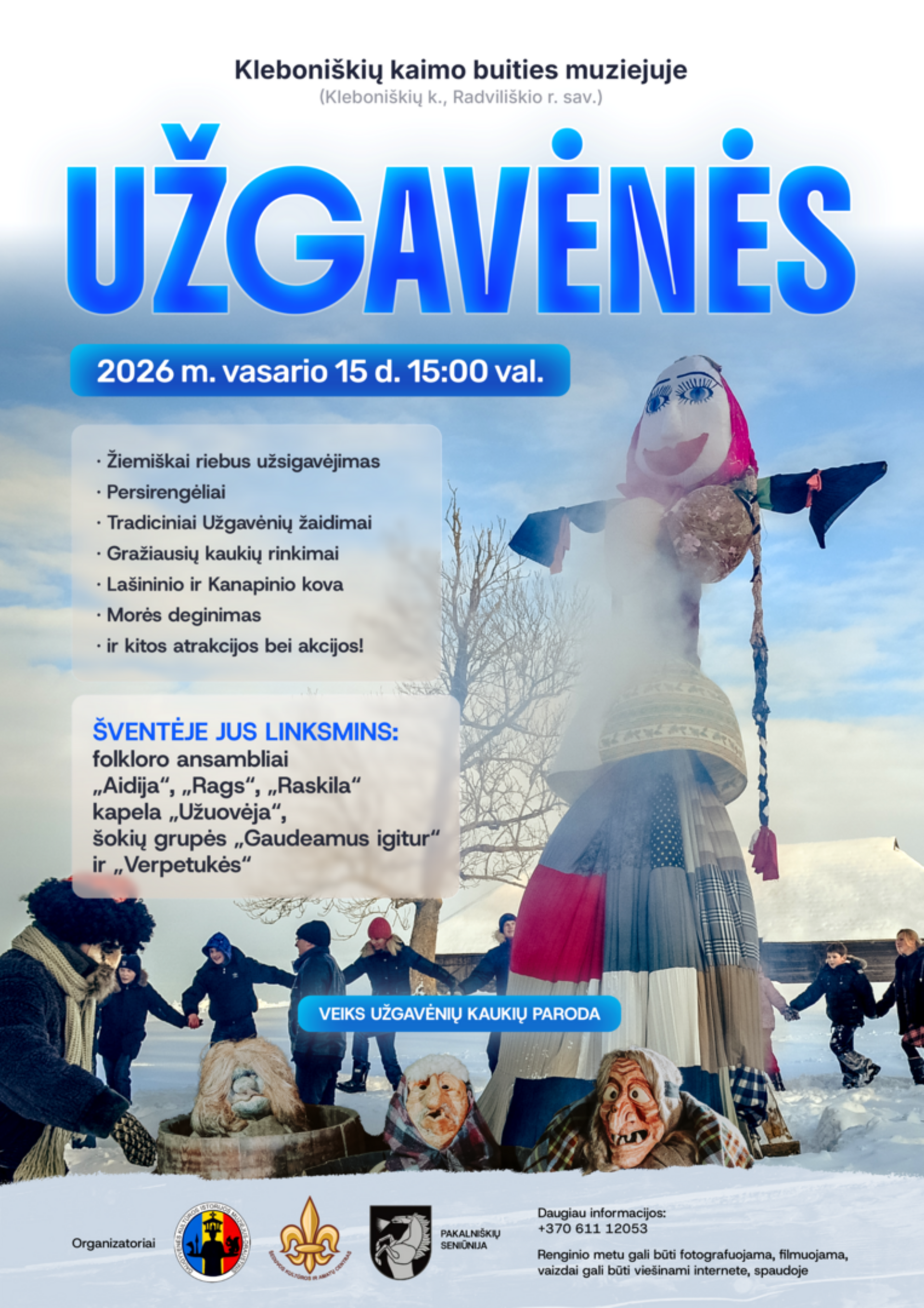Atvykusius į senąjį kaimą, visus pasitiks toks gardus kvapas, kad net seilės tįs – per Užgavėnes žiemiškai riebus užsigavėjimas būtinas! Aplink siaus, išdykaus, juokaus, pokštus krės, ateitį žadės persirengėliai – baisiai gražūs, žiauriai linksmi, be proto išmintingi. Staipysis velniai ir raganos, dairysis arkliai, ožiai, gervės bei visokiausi šio ir nepažįstamo pasaulio personažai – ko tik neprigužės į Kleboniškius Užgavėnių švęsti. Visi dalyviai kviečiami negailėti išmonės, netaupyti vaizduotės ir į šventę atvykti su savo nepakartojama kauke. Nė vienas kaukėtasis nepraslys pro akis – vyks gražiausių kaukių rinkimai.