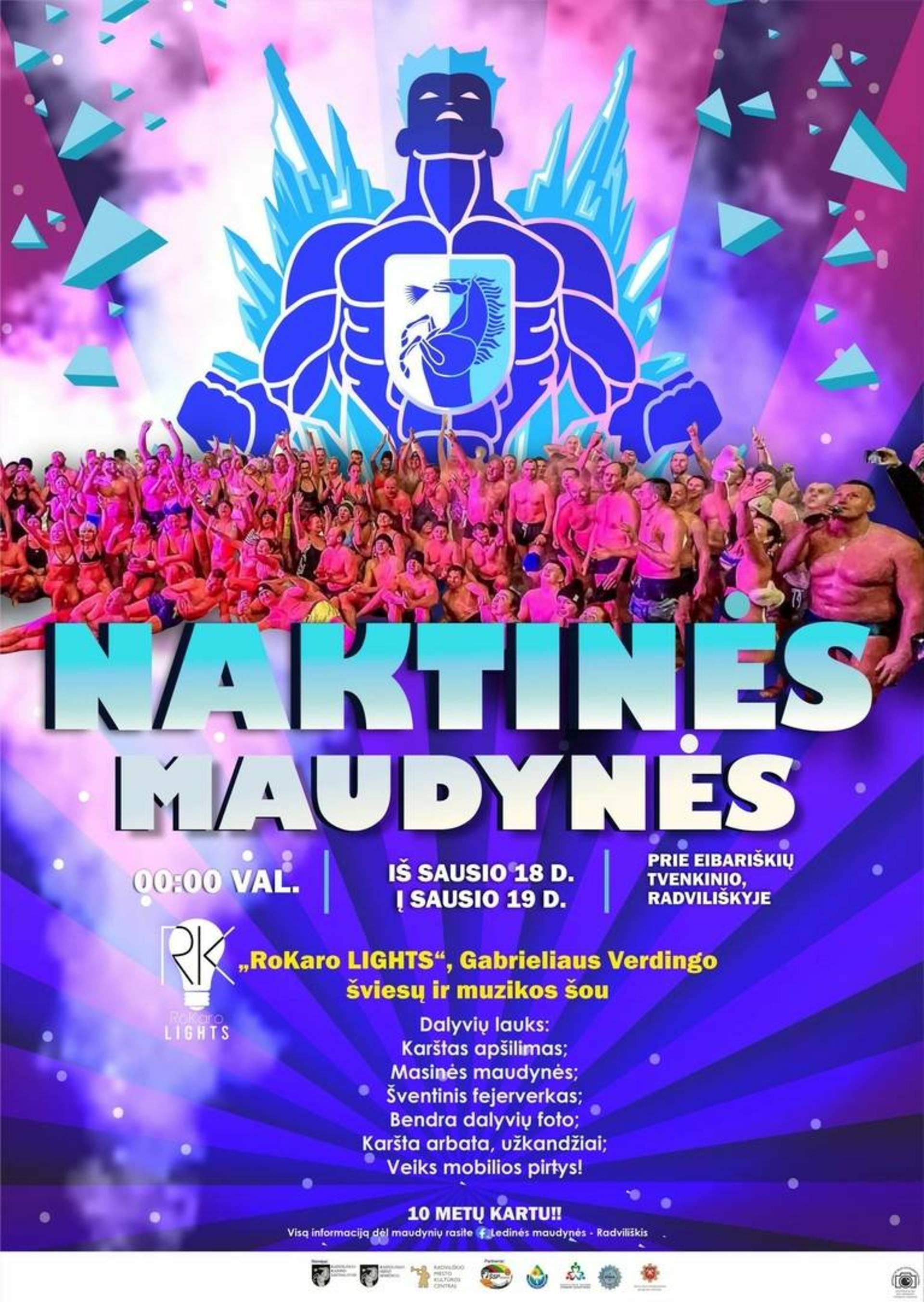 Jei ruonius matote tik zoologijos sode, žiemos maudynių aistruolius, taip pat vadinamus ruoniais, sutiksite Radviliškyje, Eibariškių parke. Naujuosius metus šie ledinio sporto ir gyvenimo būdo entuziastai pasitiko lediniame vandenyje, tad ir toliau mėgaudamiesi žiemišku oru kviečia visus į naktines ledines maudynes. Jos vyks prie Eibariškių tvenkinio, Radviliškyje, naktį iš sausio 18 į 19 (taip, tai ne savaitgalis, čia ne klaida). Čia smalsuolių ir mauduolių lauks šviesų ir muzikos šou, karštas apšilimas, masinės maudynės, karšta arbata ir užkandžiai.